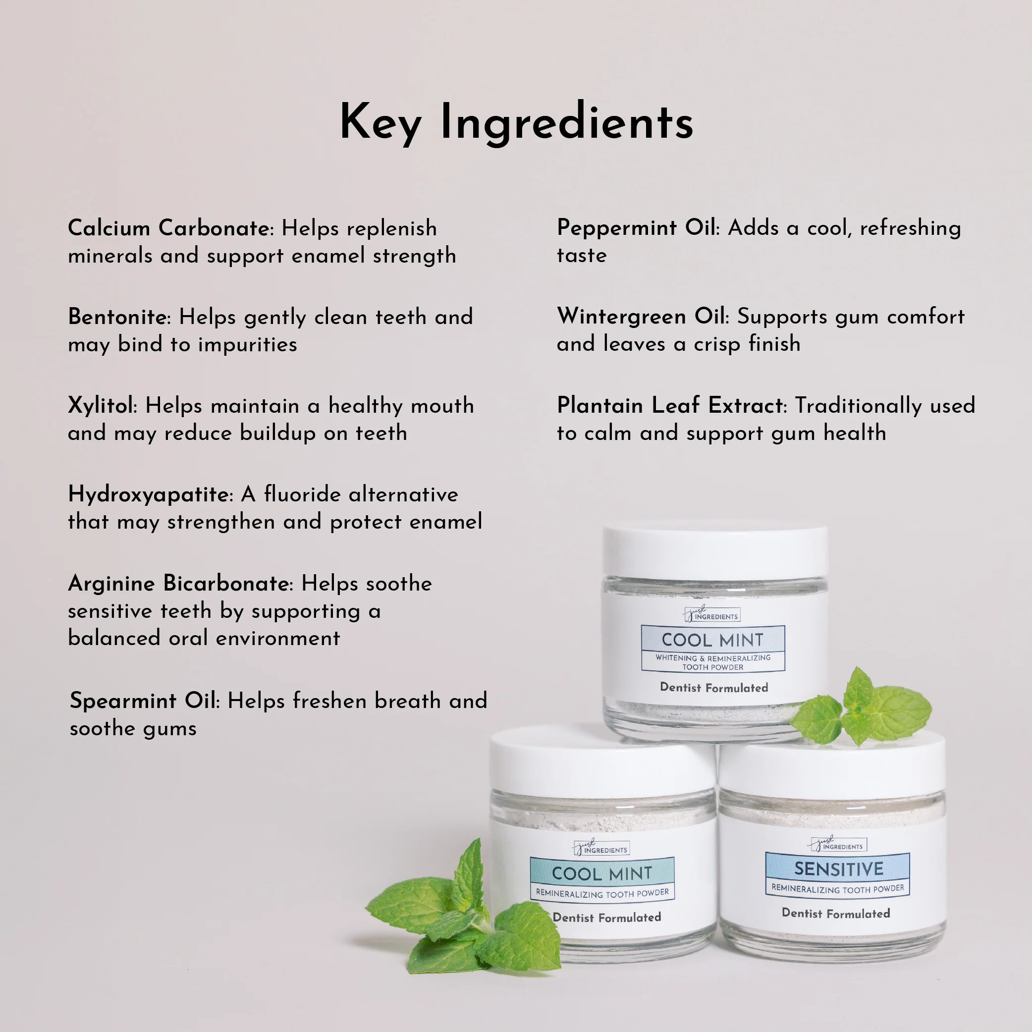 We chose to create a tooth powder with hydroxyapatite to help the teeth absorb as much as possible for maximized remineralization benefits.